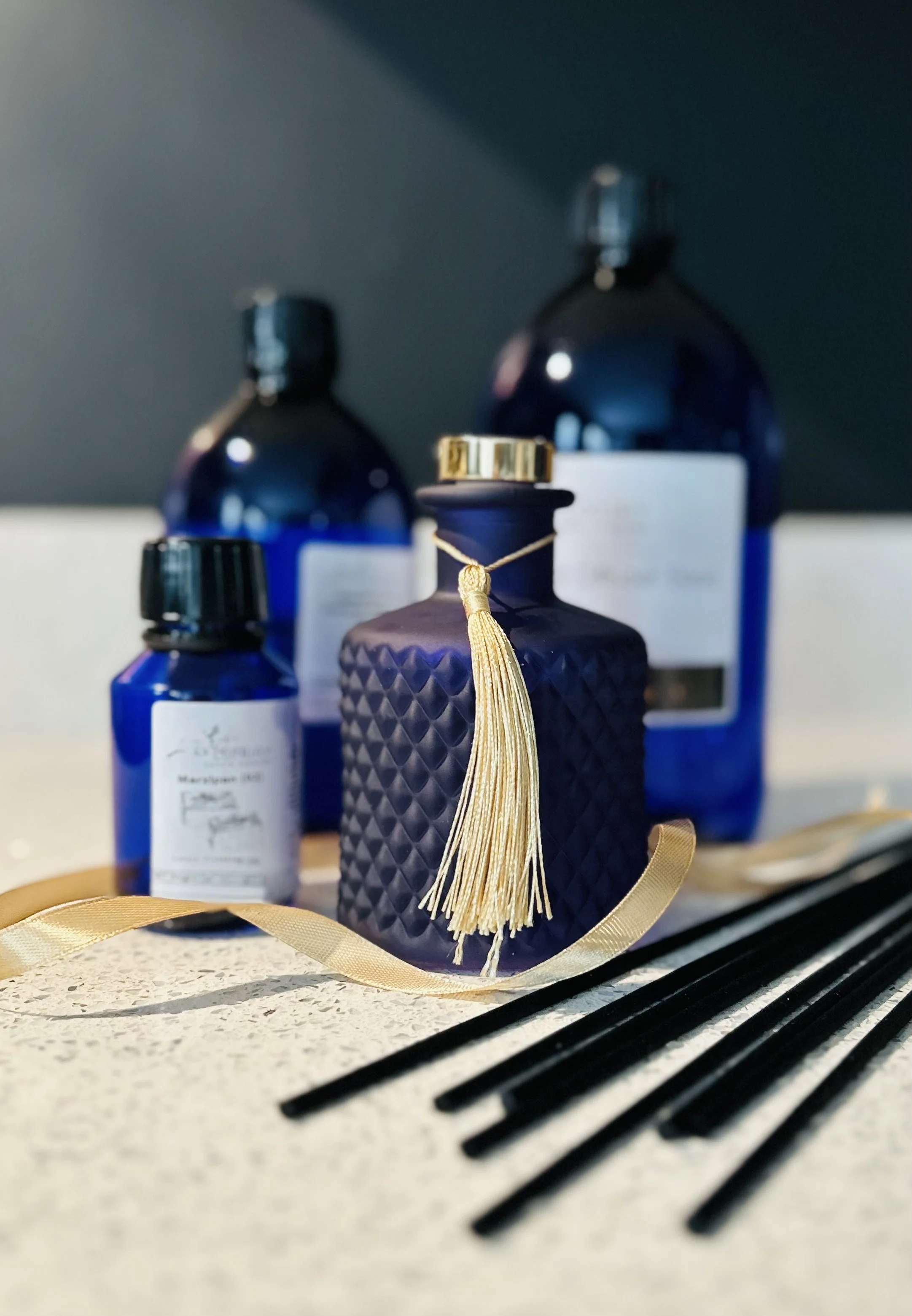 A decorative dark blue diffuser jar with a gold cap and tassel, three nearby blue bottles with white labels, and black reed diffuser sticks on a white surface.