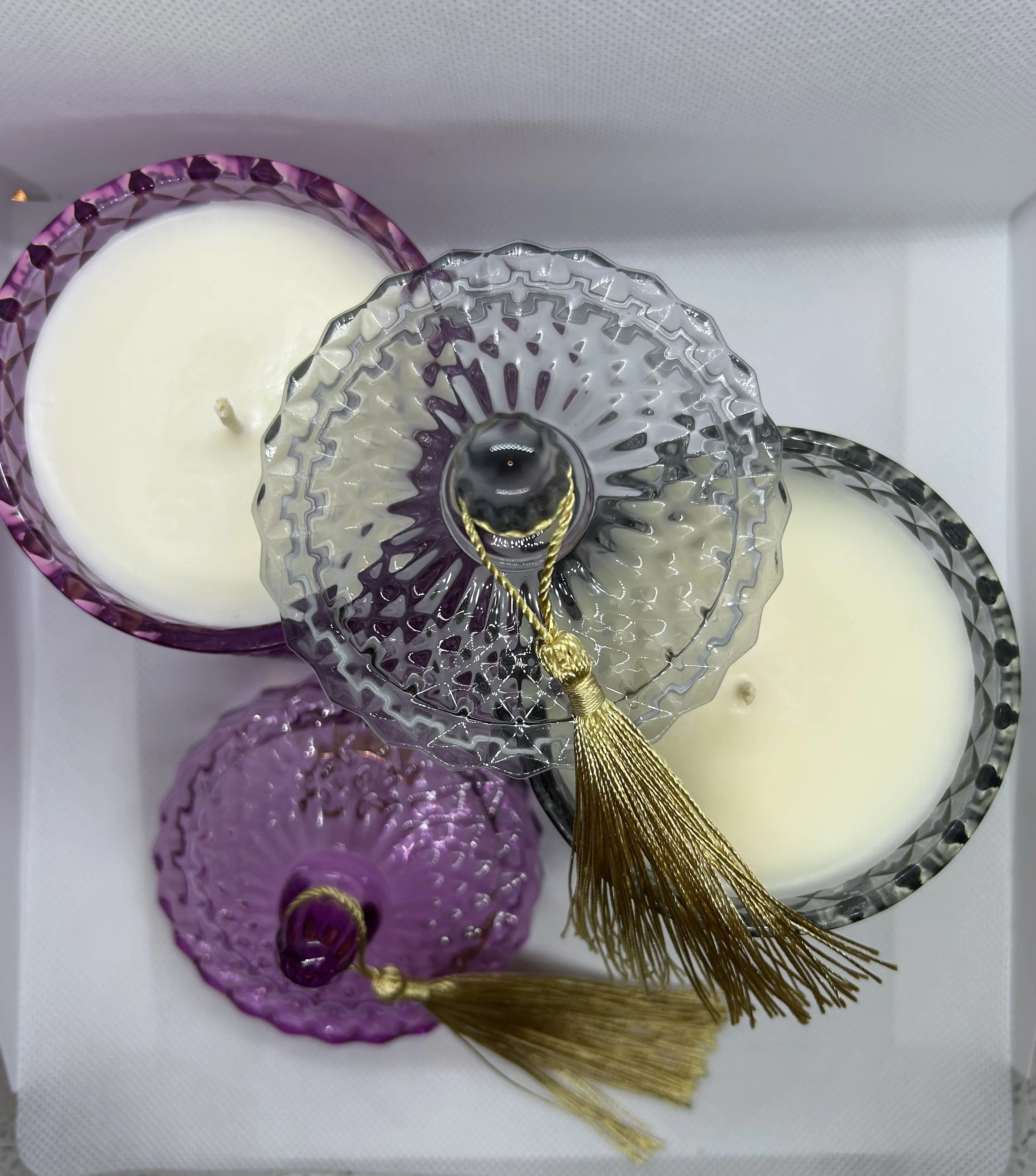 Decorative candles in purple, black, and white glass holders with gold tassels