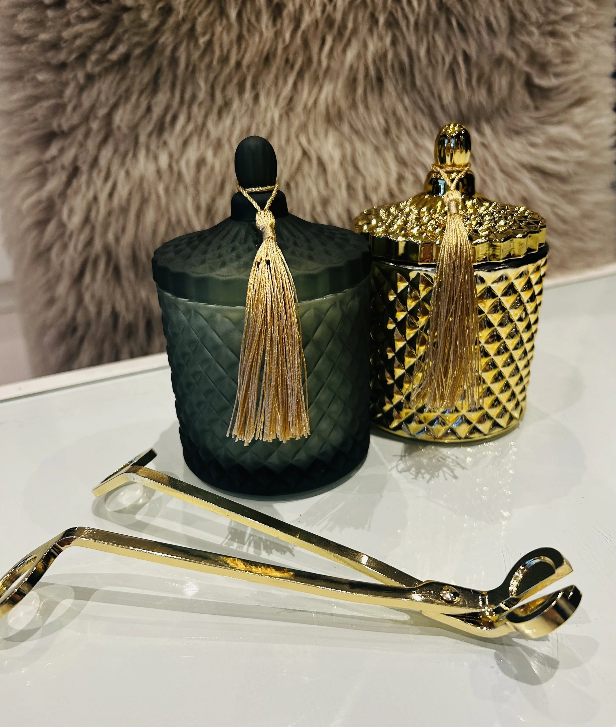 Two decorative candle jars with gold tassels and gold scissors on a white surface, with a beige furry background.